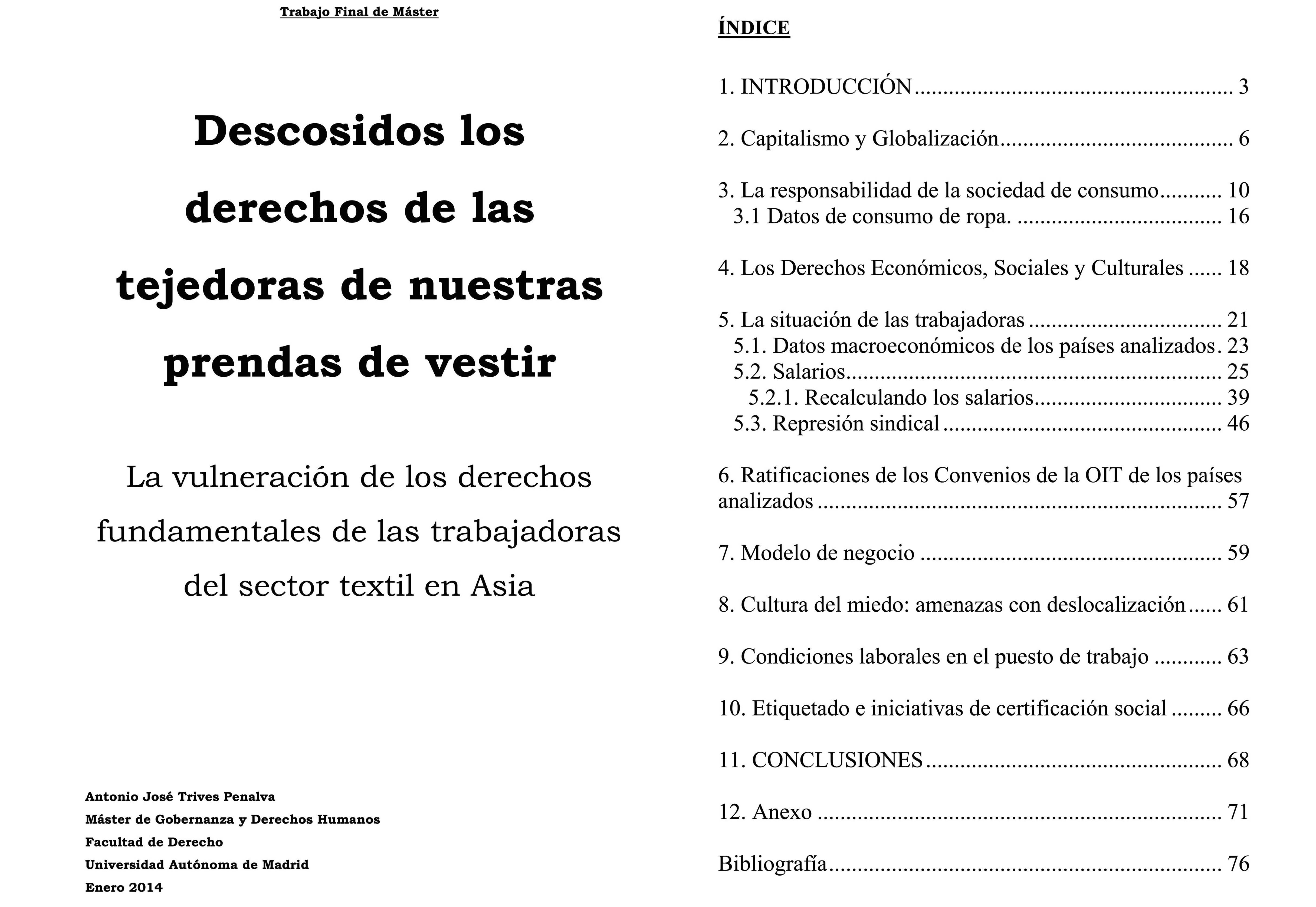 ¿Qué consecuencias tiene el consumo de la ropa que consumimos en Occidente? Trabajo de investigación sobre la vulneración de los derechos fundamentales de las trabajadoras del sector textil en Asia. Análisis de las condiciones en India, Bangladesh, Sri Lanka y Tailandia, los salarios que cobran y el que debería ser el justo y digno, ratificaciones de los convenios internacionales y los que vulneran, el modelo de negocio, la cultura del miedo, etiquetado e iniciativas de etiquetado social y la responsabilidad del sistema consumista. Incluye anexos. Investigación desarrollada para el máster de Gobernanza y Derechos Humanos de la Universidad Autónoma de Madrid.