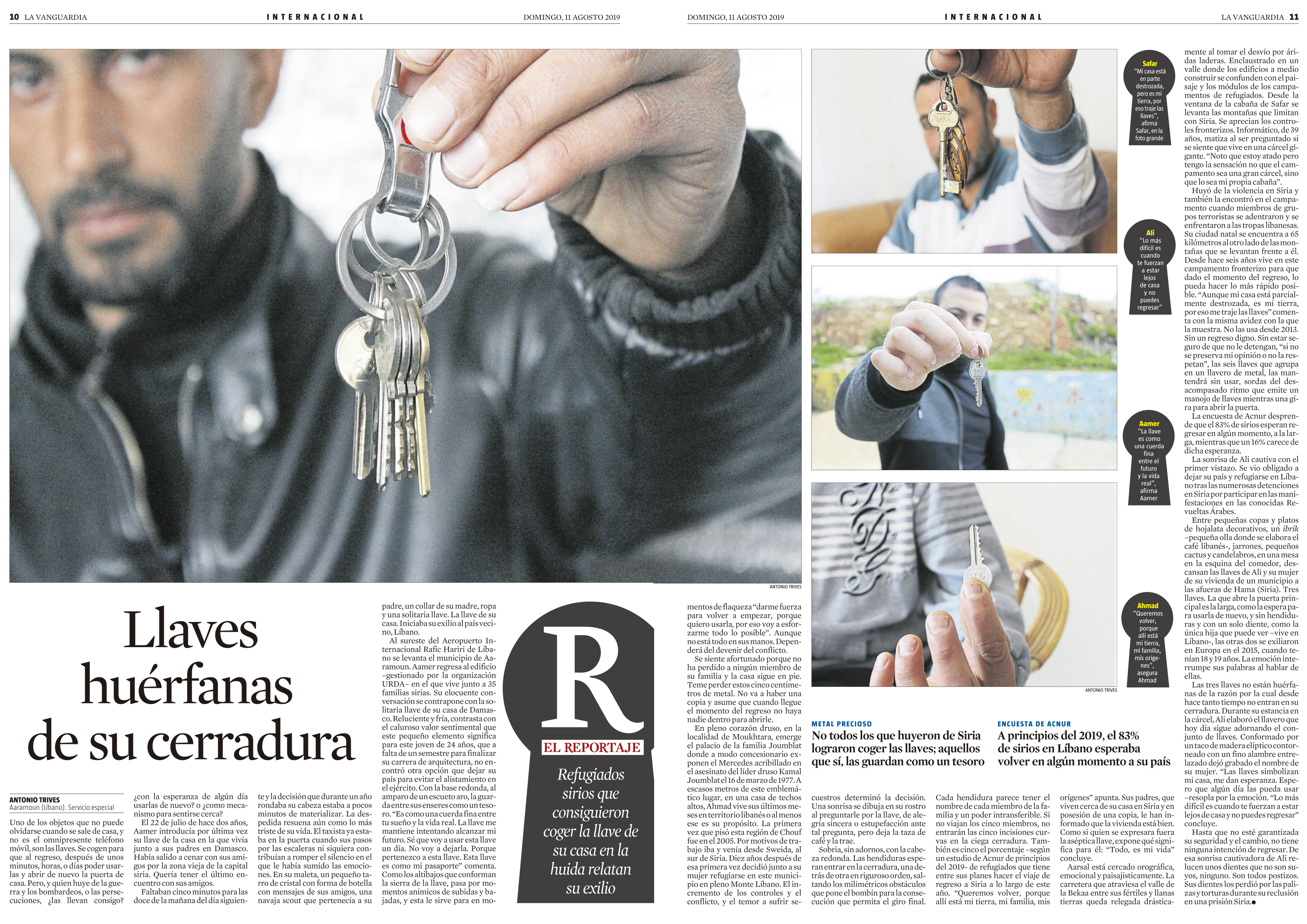 Contenido: Cuando alguien huye de la guerra, ¿tiene tiempo o puede coger las llaves de su casa, o lo que queda de ella? Los que lo consiguen y la llevan a su exilio, ¿por qué lo hacen? ¿con la intención de regresar algún día? ¿o como elemento emocional de apego? Este reportaje narra la historia de cuatro sirios refugiados en Líbano, a través de sus llaves.